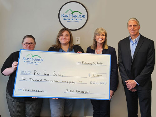 Bar Harbor Bank & Trust (BHBT) presents a donation from the Bank’s Casual for a Cause program to Pine Tree Society. Pictured from left to right: Adria King, Chief Development Officer at Pine Tree Society; Nichole England, Branch Relationship Manager at BHBT; Suzanne Moffatt, SVP Senior Wealth Manager at Bar Harbor Wealth Management; and Chris Rugullies, SVP Regional Relationship Manager at BHBT.