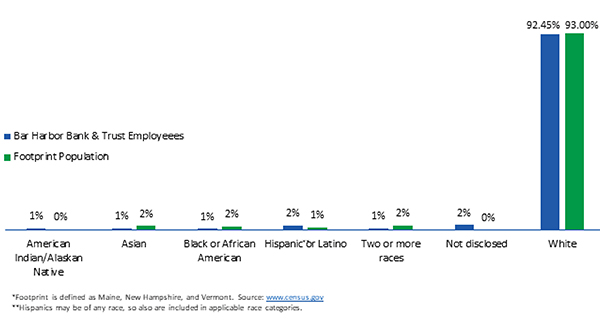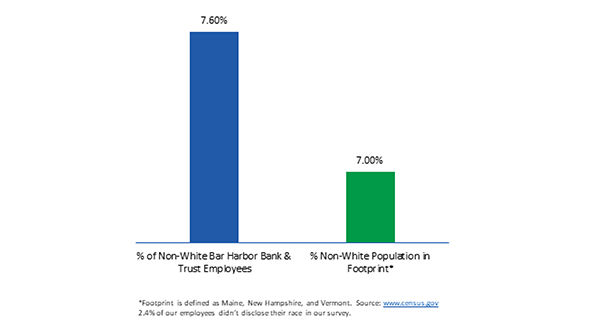 Compared to the footprint population, the Bar Harbor Bank & Trust’s employees have a similar diversity. This bar chart illustrates that 7.6% of Bar Harbor Bank & Trust employees are non-white, while 7.0% of the entire footprint population is non-white.