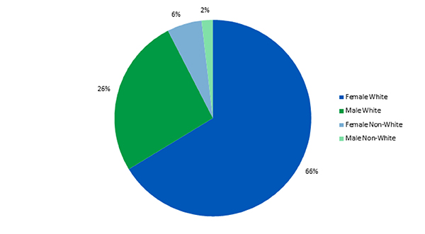 At a glance, Bar Harbor Bank & Trust possesses strong gender diversity in its workforce. This pie chart illustrates that 66% of employees are white females, 26% are white males, 6% are non-white females, and 2% are non-white males.